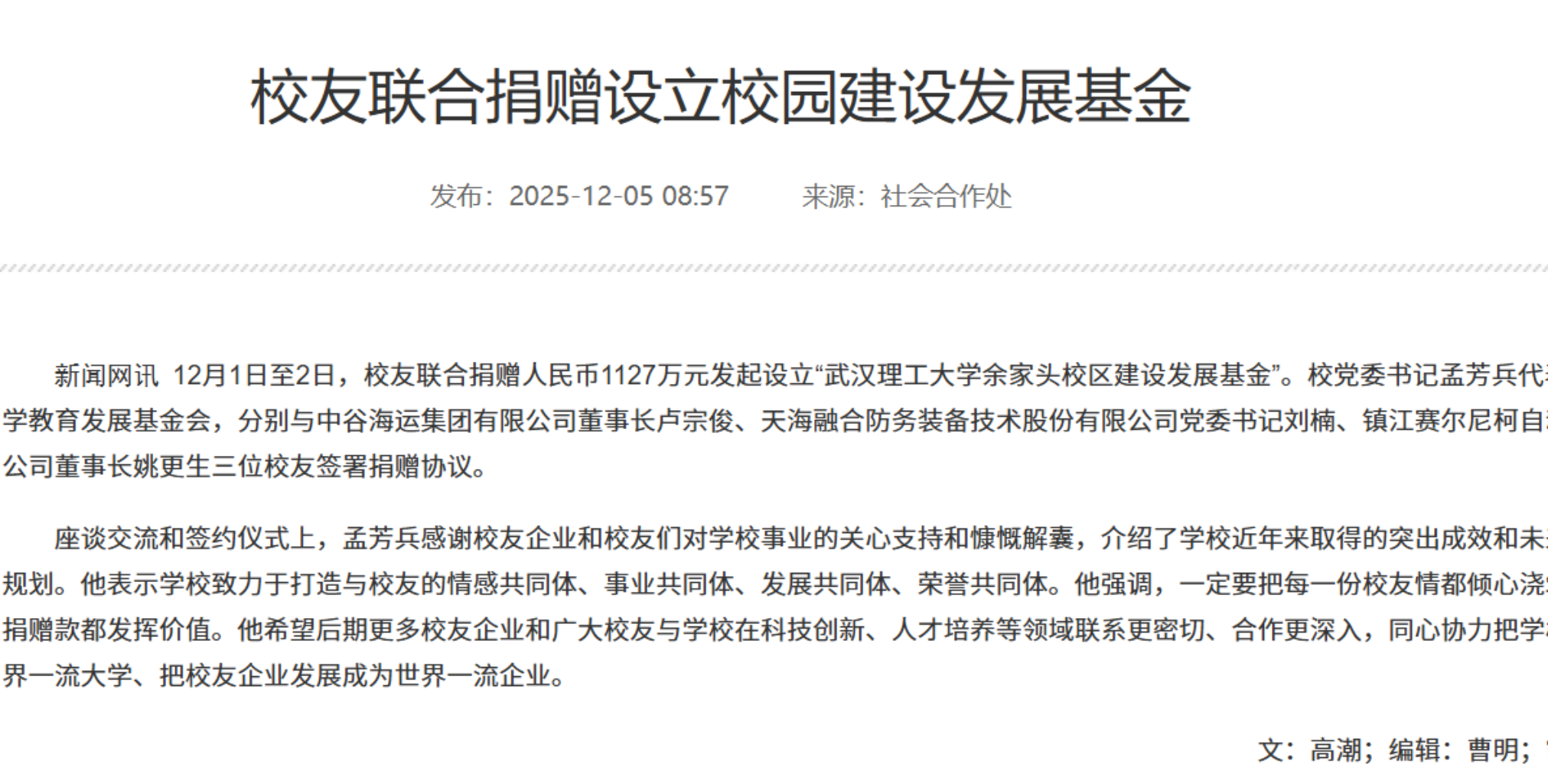 12月1日至2日,校友联合捐赠人民币1127万元发起设立“武汉理工大学余家头校区建设发展基金”。校党委书记孟芳兵代表武汉理工大学教育发展基金会,分别与中谷海运集团有限公司董事长卢宗俊、天海融合防务装备技术股份有限公司党委书记刘楠、镇江赛尔尼柯自动化股份有限公司董事长姚更生三位校友签署捐赠协议。