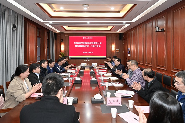 孟芳兵代表学校对周秩军一行来校交流表示热烈欢迎,并从办学规模、学科建设、人才培养、科技创新、毕业生就业等方面简要介绍了学校有关情况。他表示,贵州轮胎从生产第一条汽车轮胎,到产量位居全国前列,从技术“跟跑”到打破国外技术垄断,从国内市场到全球市场,贵州轮胎从“前进”开始不断实现突破,在高质量发展的道路上跑出了“加速度”,此次来校交流,标志着校企双方即将开启全新合作,将为学校高质量发展增添新动力。