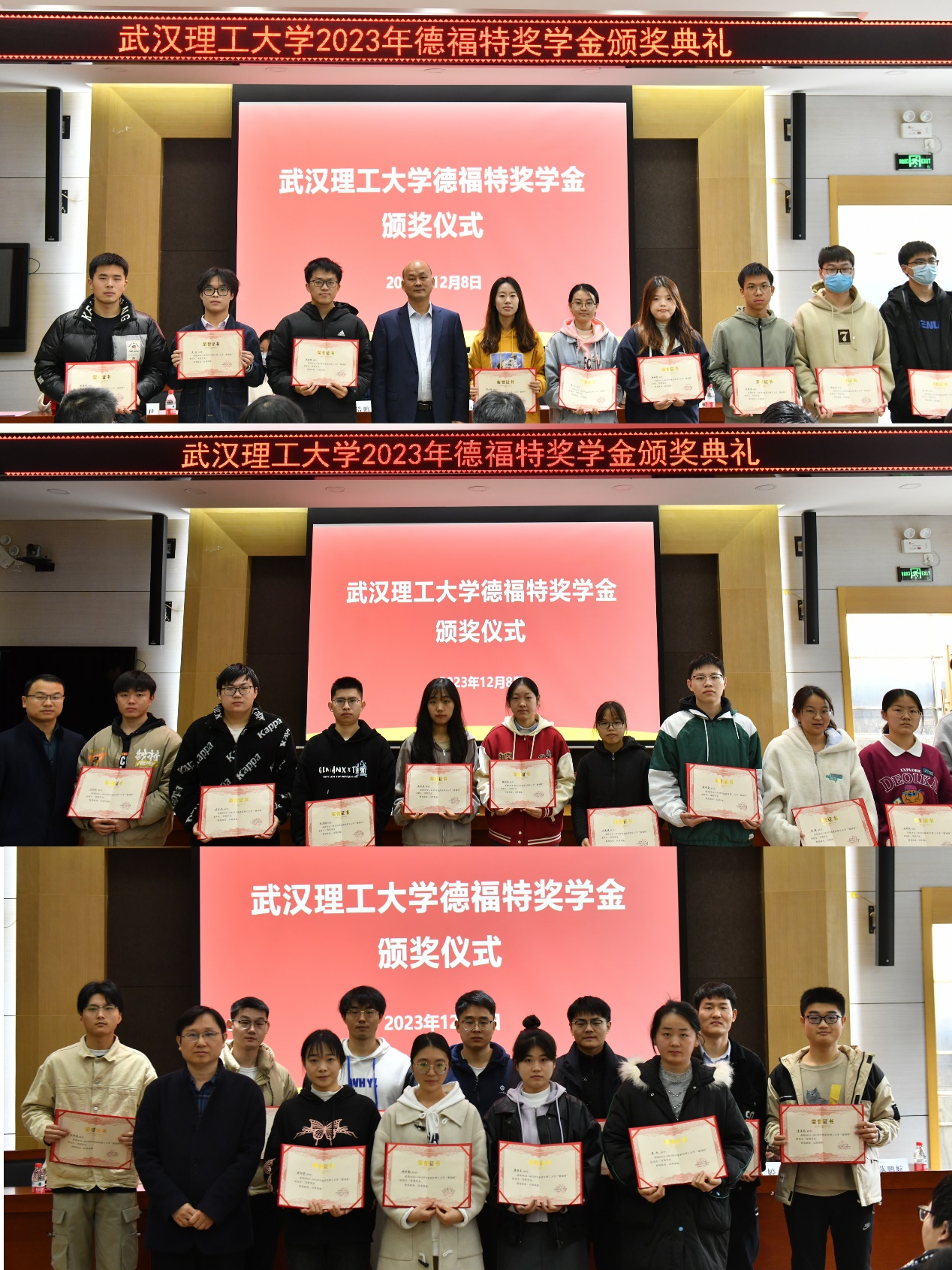 为表彰材料学院优秀学子,激励学生奋发向上,材料学院于12月8日上午10时在西院测试中心报告厅举行“德福特”奖学金颁奖仪式。出席本次颁奖仪式的领导与嘉宾有广西德福特科技有限公司总经理蓝国勇,材料学院党委副书记田仕,材料学院复合材料与工程系党支部书记蔡浩鹏,以及辅导员和获奖学生代表。本次颁奖仪式由材料学院学工办辅导员陈鹏航主持。