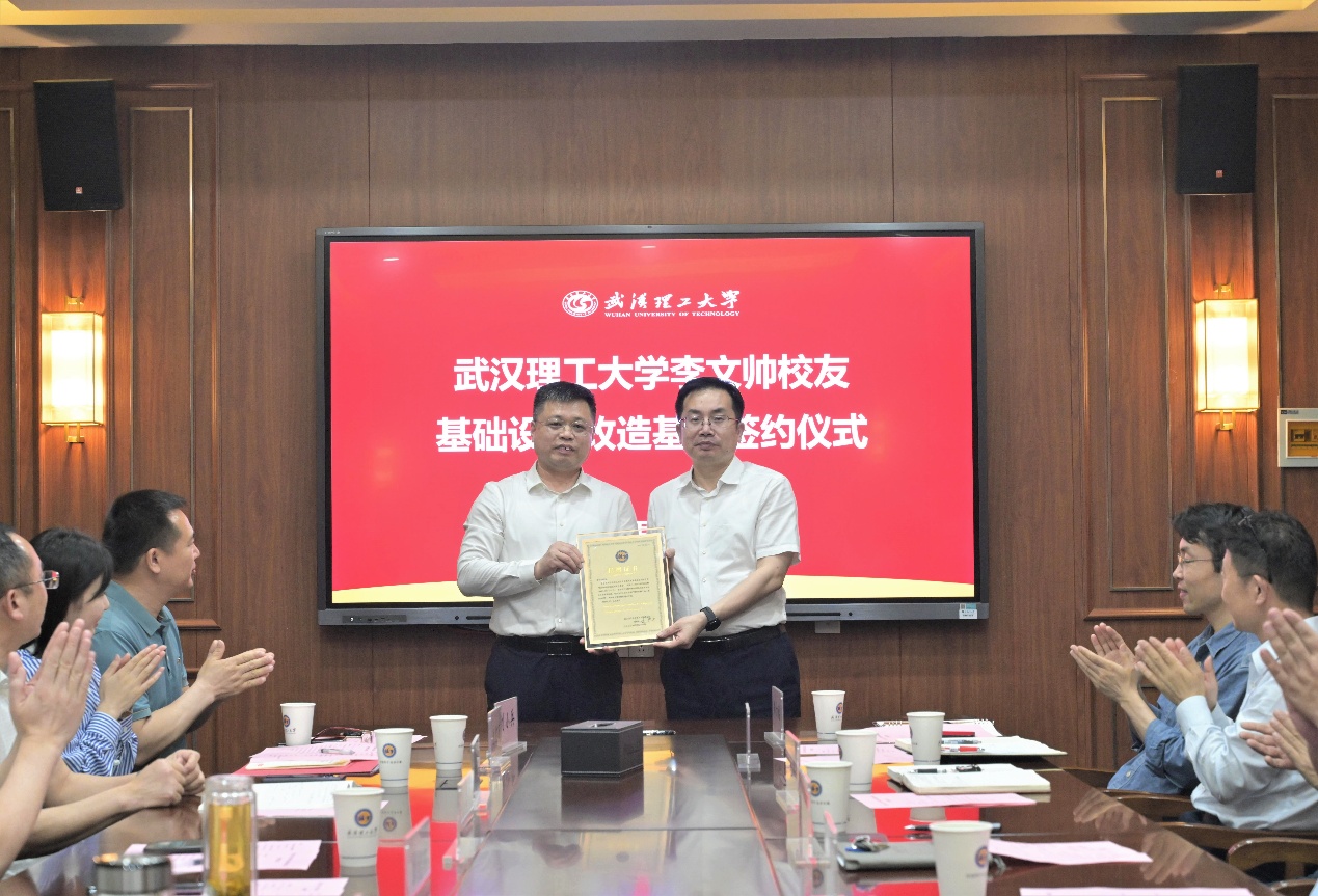 4月21日,李文帅校友基础设施改造基金捐赠仪式在学校举行。湖北省人大代表、湖北省山东商会会长、湖北精英盛华信息科技股份有限公司董事长、94级工民建校友李文帅,副校长沈革武出席捐赠仪式。
