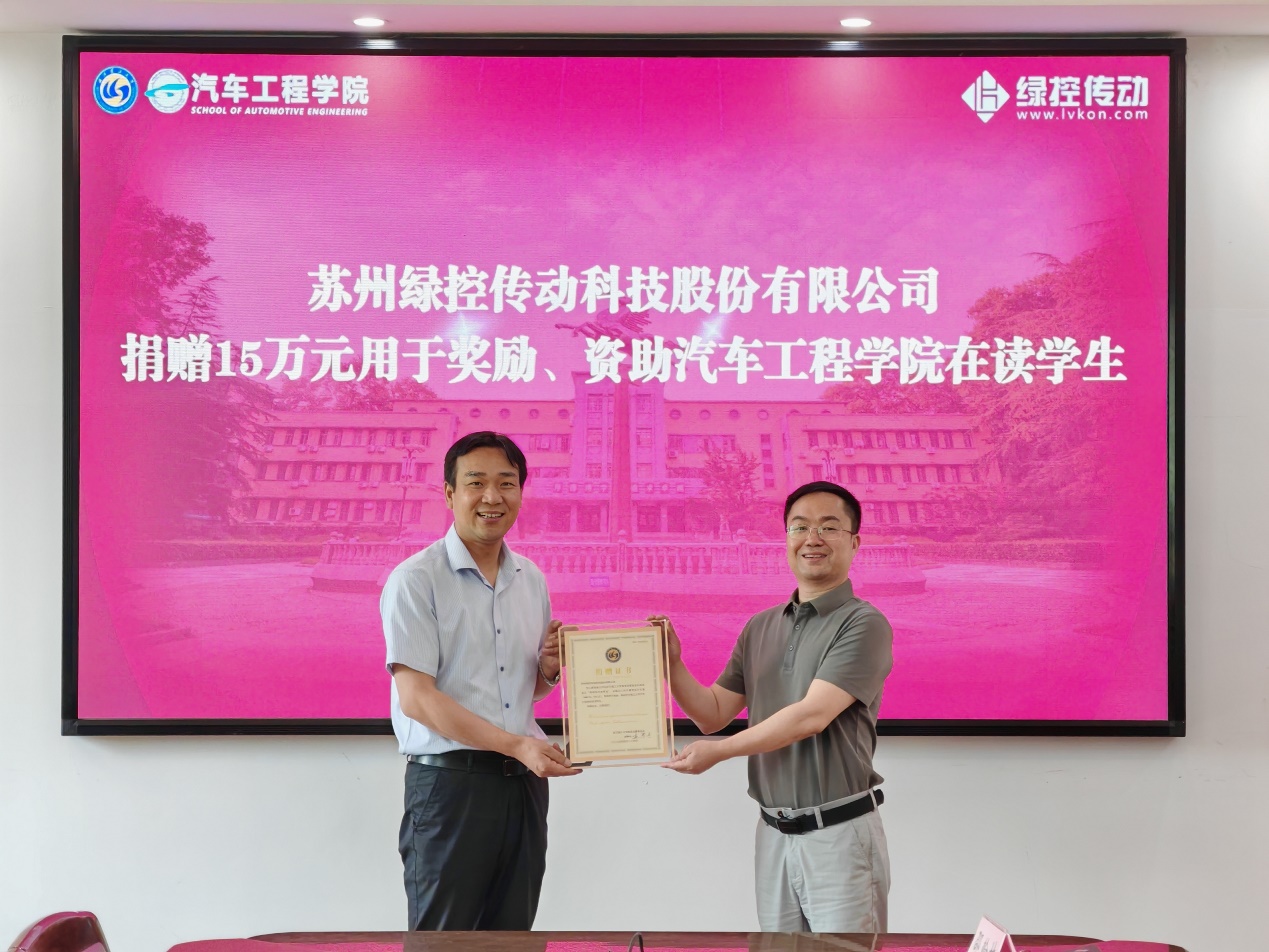 随后,双方进行“绿控传动奖学金”签约仪式。杨万庆副处长代表学校与公司代表钱程现场签约,刘耀胜书记向陆翠魁总监颁发捐赠证书。此项奖学金的设立旨在激励学院优秀学子不断进取,支持学院为行业发展培养更多优秀人才。