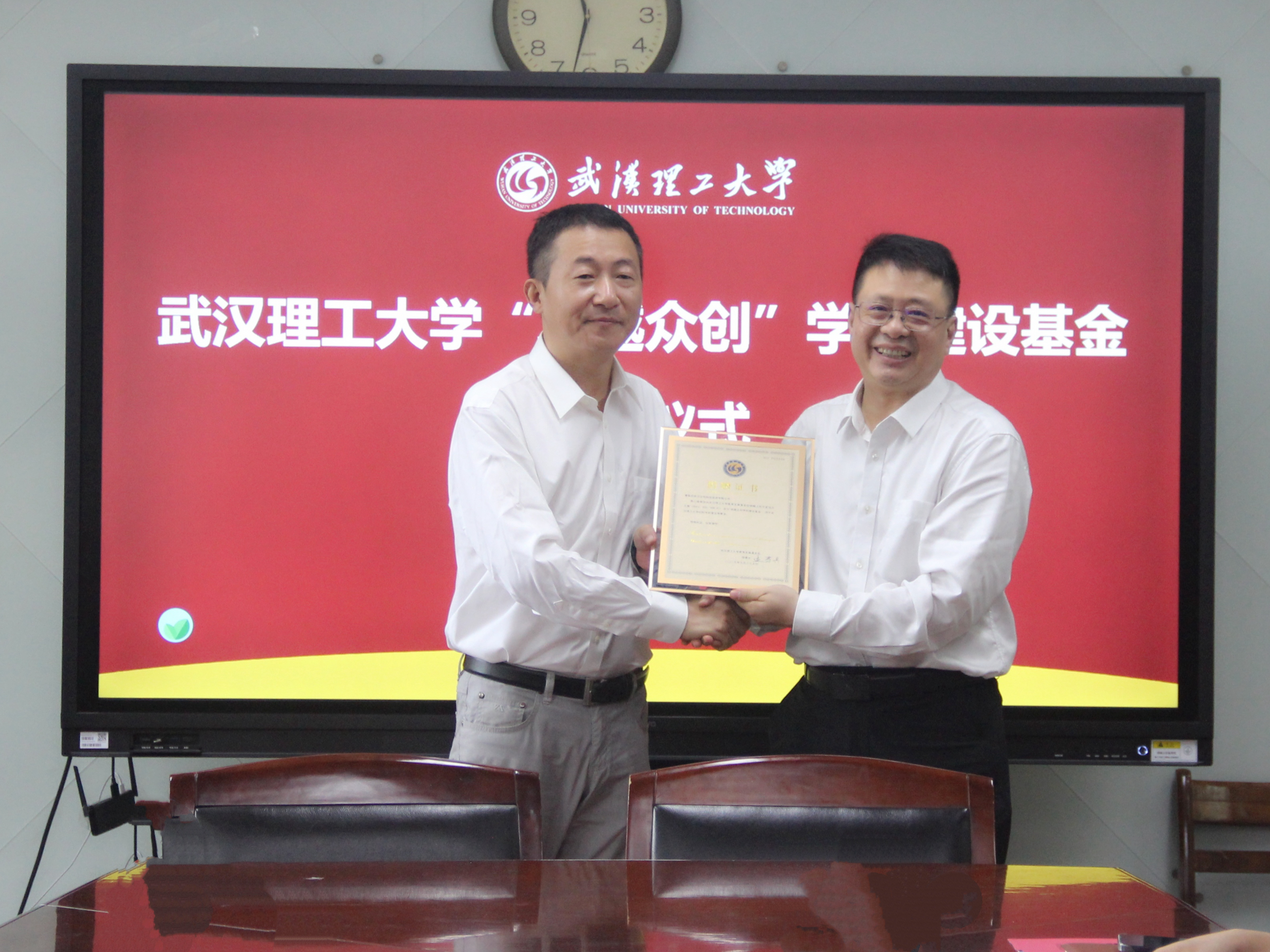 麦立强副校长代表学校向武汉众创科技投资有限公司颁发捐赠证书。