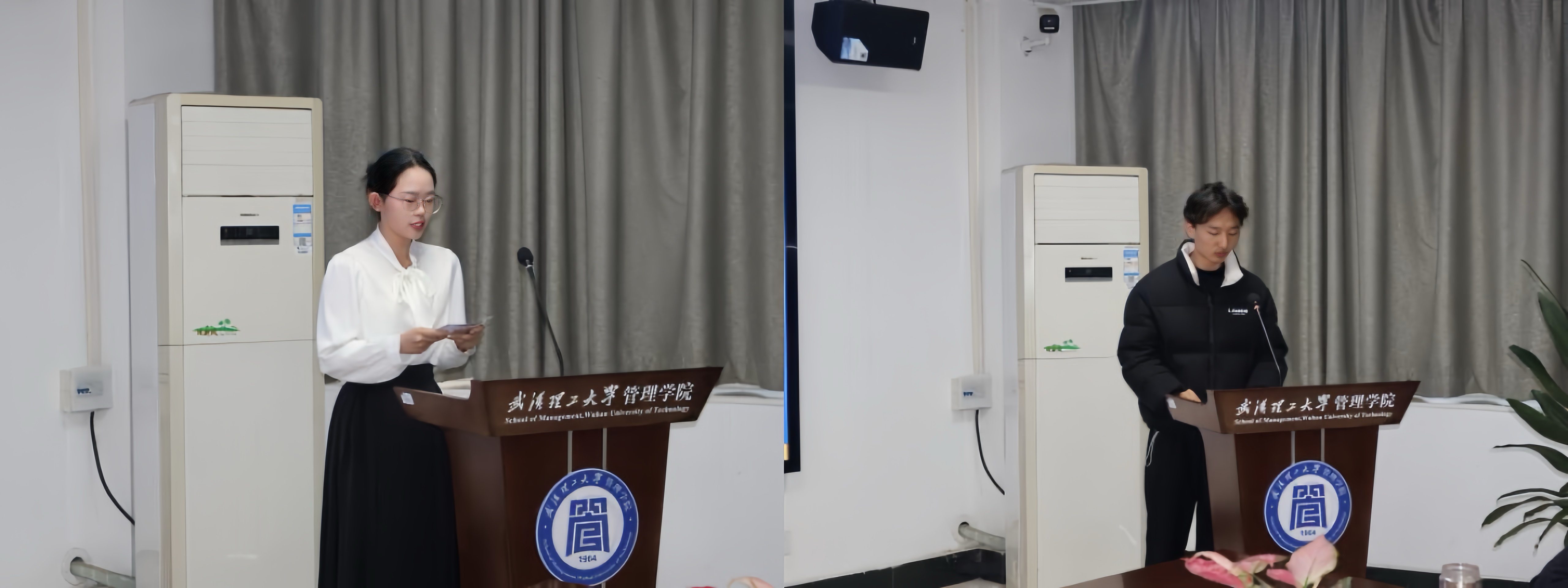 金坤一等奖学金获得者、营销2301班王诗宇同学分享了自己以周金坤校友为榜样,在学业、科研与竞赛实践中深耕不辍的成长历程,表达了对校友、学校与学院的感恩之情;金坤助学金获得者、信管2202班朱成志同学则讲述了校友的奋斗故事给自己带来的精神激励,并表示将把这份关爱转化为前行动力,继续不懈奋斗。