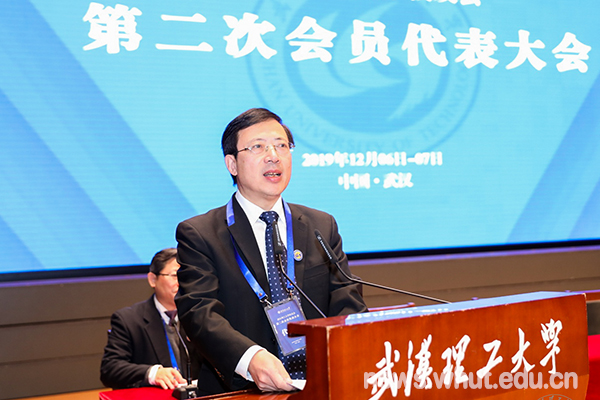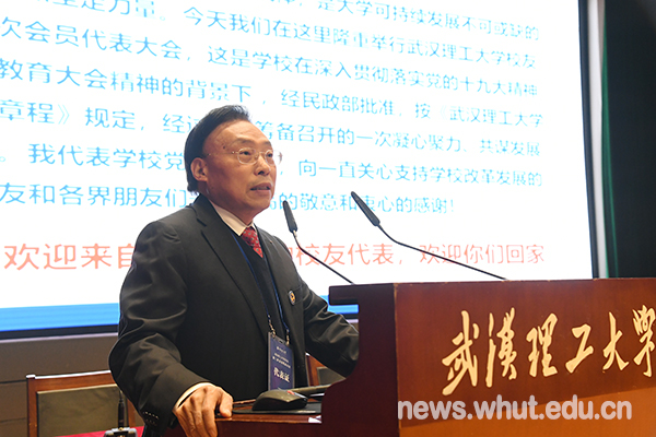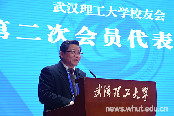 张清杰校长代表学校向一直关心支持学校改革发展的广大校友和各界朋友们表示感谢!他指出,校友是大学精神最鲜活的载体,是大学可持续发展不可或缺的宝贵资源和坚定力量。校友会第二次会员代表大会的召开是学校在深入贯彻落实党的十九大精神和全国教育大会精神的背景下,经民政部批准,按《武汉理工大学校友会章程》规定,经过认真筹备召开的一次凝心聚力、共谋发展的盛会。他从学校办学特色和战略规划、“双一流”建设制度创新、“双一流”建设显著成效等方面向参会代表介绍了学校发展情况。他强调,学校即将迎来合并组建20周年,回首合并组建近20年的改革发展,学校之所以能克服一个又一个困难,取得一个又一个成就,靠的就是全体理工大人的奋斗和拼搏。