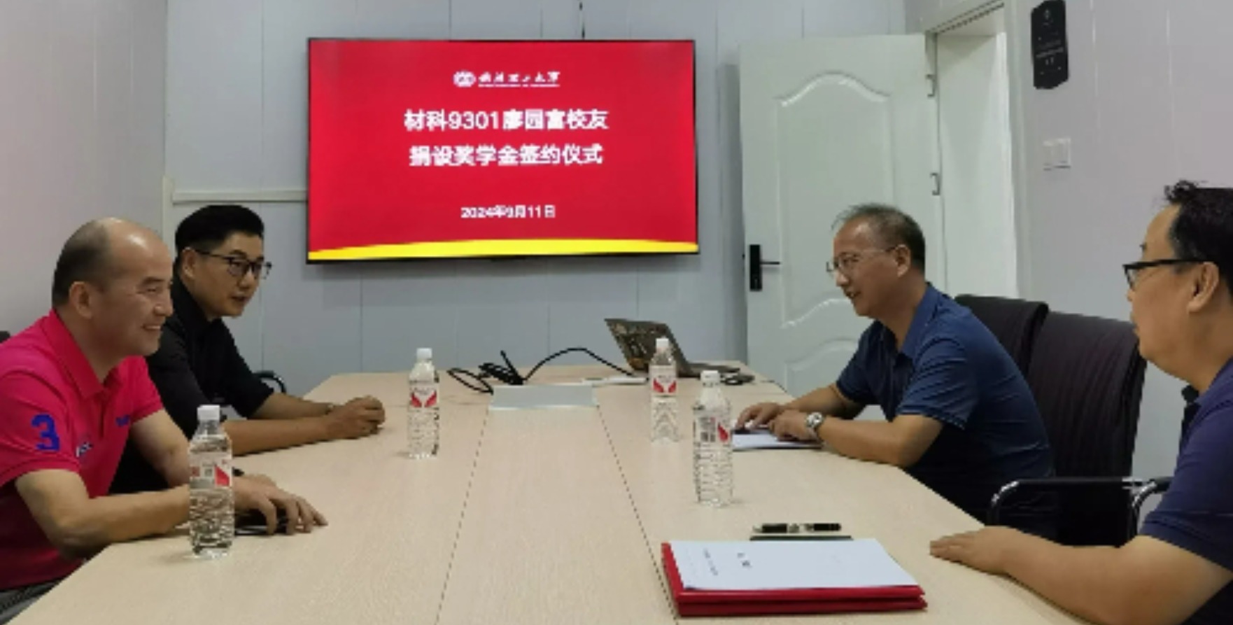 9月11日,材科9301班廖园富校友捐资设立“园梦奖学金”捐赠仪式在校举行。材科9301班校友廖园富,社会合作与校友工作处副处长杨万庆、材料科学与工程学院副院长文佐勤参加捐赠仪式。